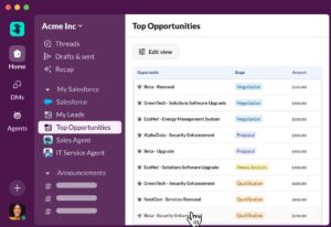 Slackは今回のアップデートにより、「Agentforce Sales」「IT Service」「HR Service」「Tableau Next」などのアプリをSlack上から直接操作できるようにし、CRM(顧客管理システム)を“対話型”へと進化させるとしている。